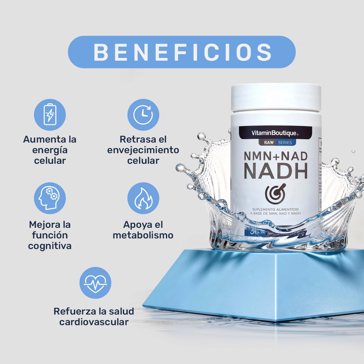 NADH es fundamental para la producción de energía en cada célula de tu cuerpo. Piensa en él como el motor que impulsa tus funciones vitales. Nuestro producto, con NMN, NAD y NADH, interviene directamente en la síntesis de ATP, la moneda energética celular. Favorece la reparación del ADN, un proceso clave para la longevidad celular. Mejora la eficiencia de tus mitocondrias, esas pequeñas centrales de energía dentro de tus células.