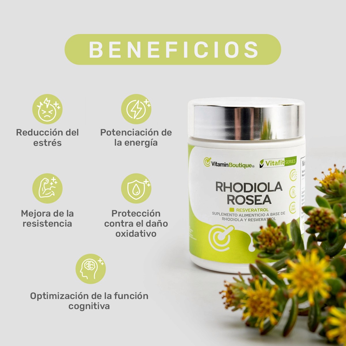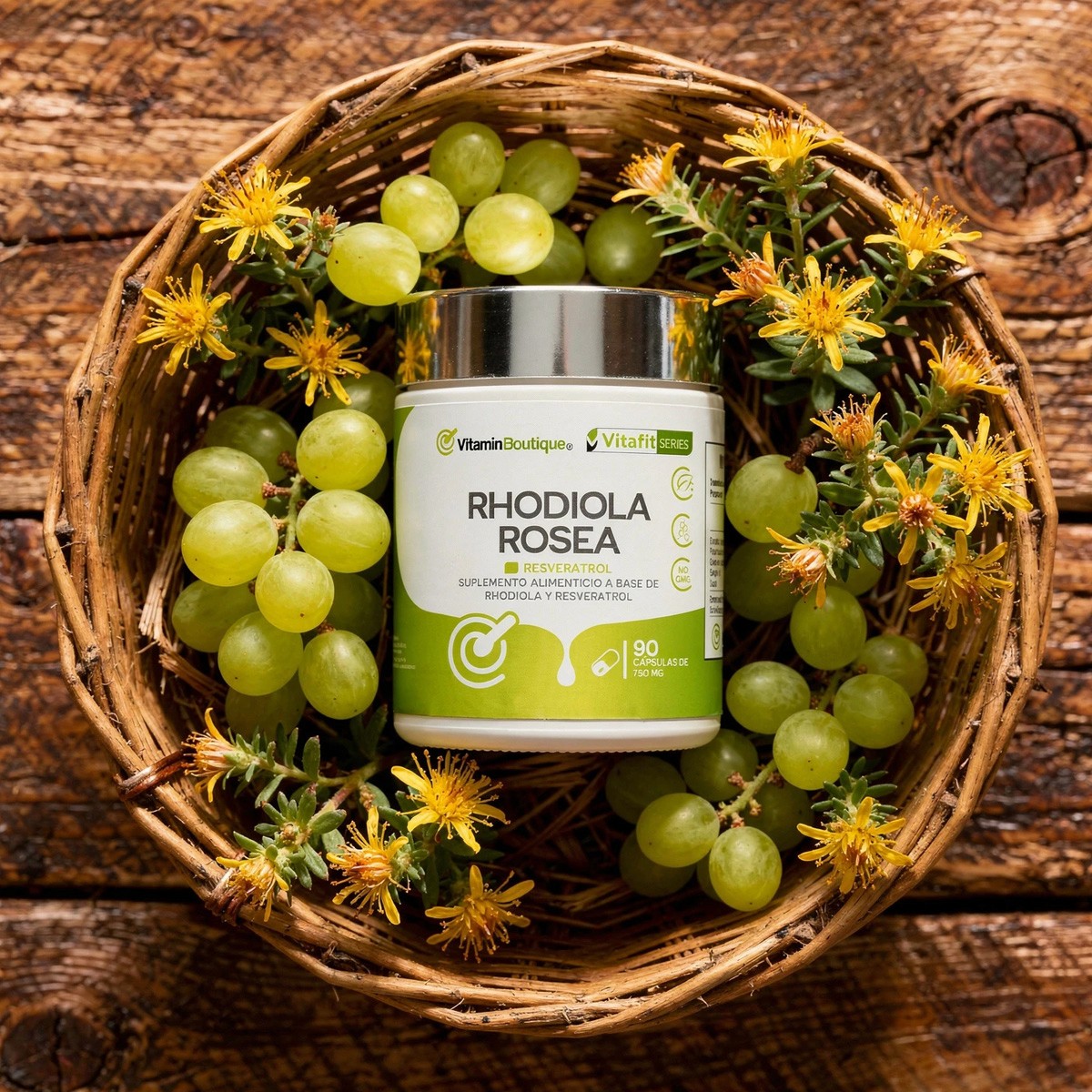 En Vitamin Boutique, unimos la ciencia avanzada con lo mejor de la naturaleza para crear aliados que potencian tu vitalidad. Conoce nuestro suplemento Rhodiola Rosea Resveratrol, una fórmula experta diseñada para elevar tu rendimiento físico y mental. Este suplemento en cápsulas trabaja para reducir el estrés que te frena. Potencia tu energía natural. Mejora tu resistencia para que enfrentes tus actividades con mayor facilidad. Actúa como un potente antioxidante. Protege tus células contra el daño oxidativo. Favorece la salud cardiovascular.
