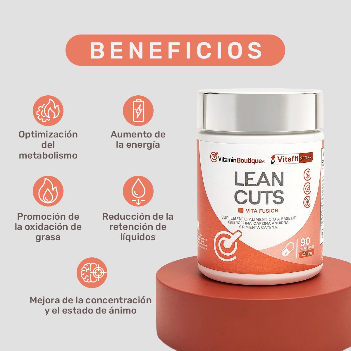 Lean Cuts es un suplemento en cápsulas diseñado para apoyar la oxidación de grasa, acelerar el metabolismo y mejorar el rendimiento físico y mental. Su fórmula avanzada también ayuda a controlar el apetito, reducir la retención de líquidos y elevar el estado de ánimo, convirtiéndose en un aliado ideal para quienes buscan un cuerpo más definido, ligero y saludable.