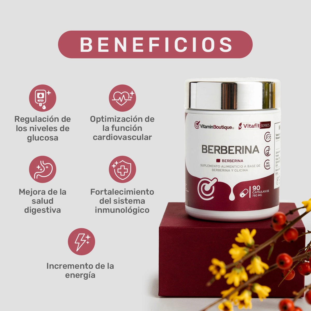 Berberina es un suplemento natural con amplios beneficios clínicamente respaldados. Actúa como un regulador metabólico que ayuda a controlar los niveles de glucosa en sangre, mejora la salud cardiovascular y favorece una digestión eficiente. Además, fortalece el sistema inmunológico y proporciona un aumento sostenible de la energía y el rendimiento físico.