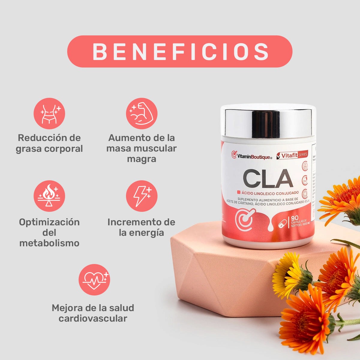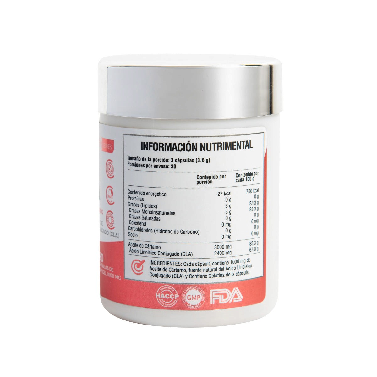 CLA (Ácido Linoleico Conjugado) es un suplemento en cápsulas diseñado para apoyar la reducción de grasa corporal, el aumento de masa muscular magra y la optimización del metabolismo. Su fórmula natural promueve una mejor utilización de la energía, mejora la definición física y contribuye al mantenimiento de una salud cardiovascular óptima.