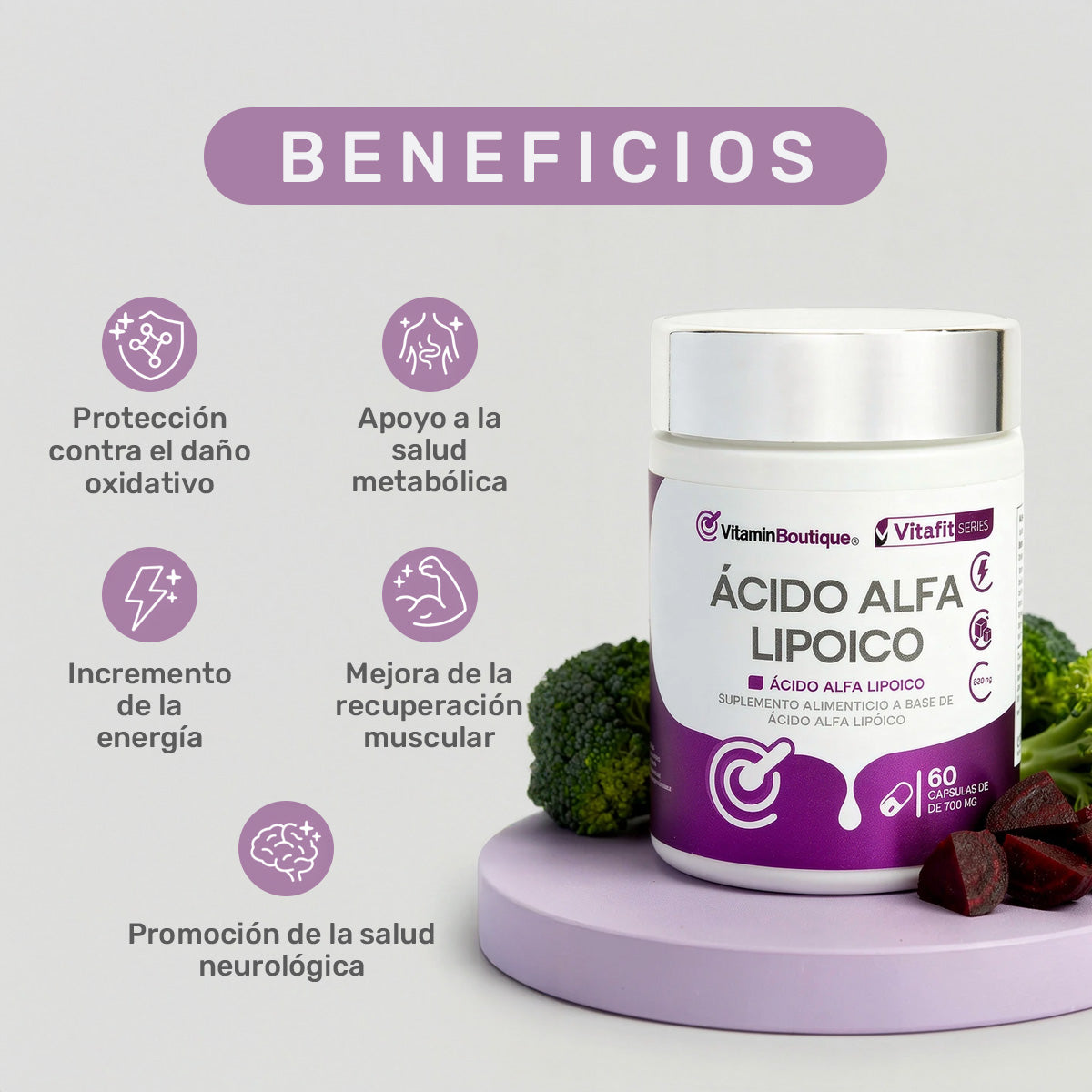 El Ácido Alfa Lipoico (ALA) es un potente antioxidante de acción dual —actúa tanto en medios acuosos como lipídicos— lo que le permite intervenir en múltiples tejidos y proteger las células del daño oxidativo. Funciona como cofactor enzimático mitocondrial, esencial en la producción energética (ATP), y desempeña un papel clave en el metabolismo de la glucosa, la regeneración de antioxidantes y la estabilidad del sistema nervioso.