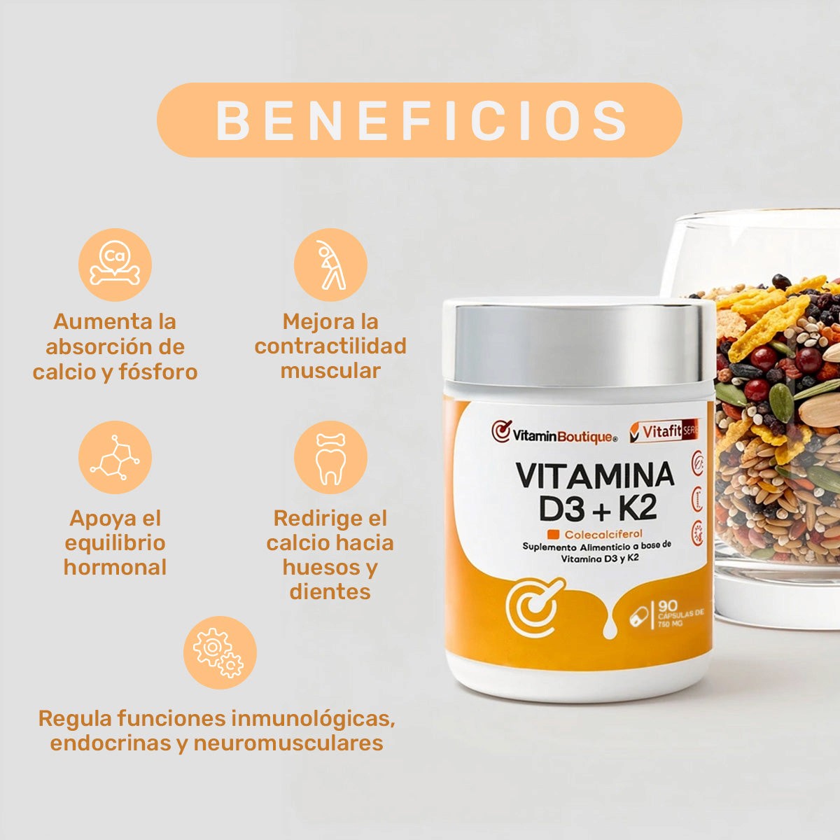 La combinación de Vitamina D3 y Vitamina K2 trabaja de forma sinérgica para promover una mineralización ósea eficiente y una protección cardiovascular activa. Mientras la D3 mejora la absorción intestinal de calcio y fósforo, la K2 lo dirige adecuadamente hacia huesos y dientes, evitando su acumulación en arterias.